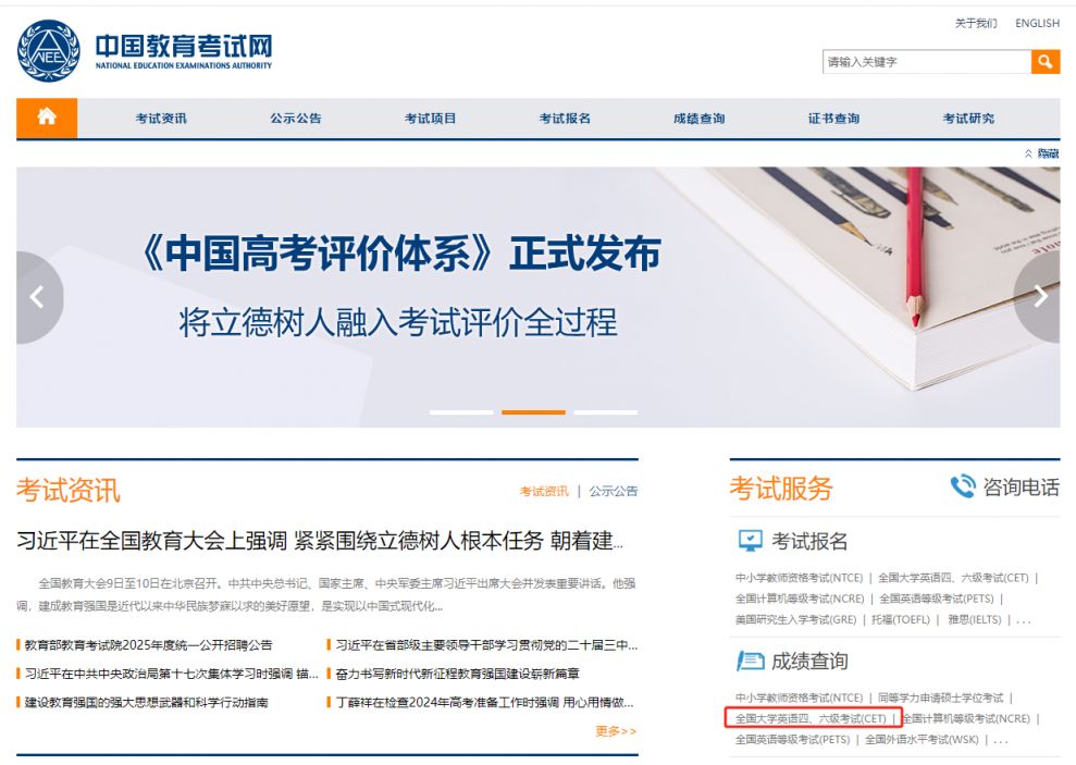 查询入口:中国教育考试网(https://www.neea.edu.cn/)