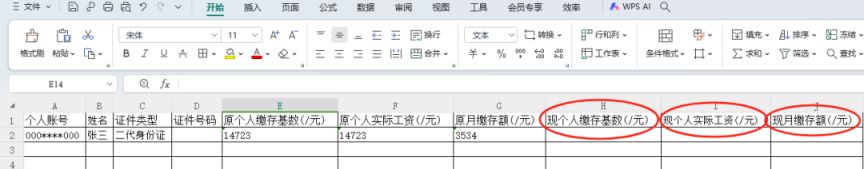 (4)、在导出的excel表格中,修改【现个人缴存基数(/元)】、【现个人实际工资(/元)】、【现月缴存额(/元)】。