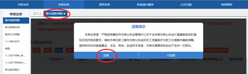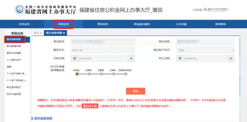 (1)、单位经办人可通过点击横向菜单中【申报业务】后,然后选择左侧菜单中的【缴存基数调整】。