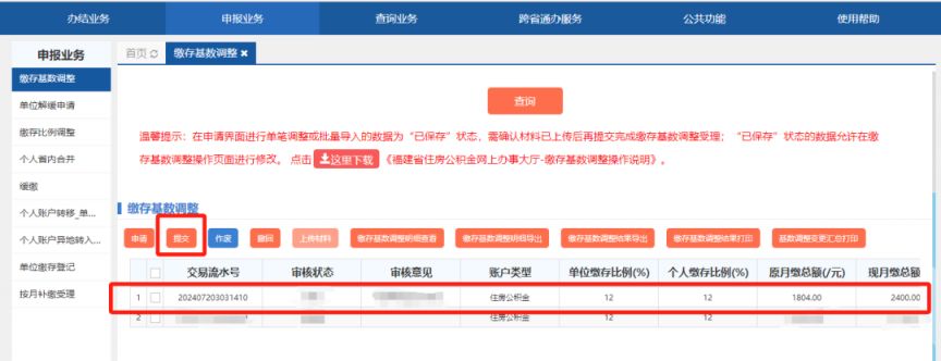(4)、在申请界面选择审核状态为“已保存”的数据,需确认无误后点击【提交】完成缴存基数调整。