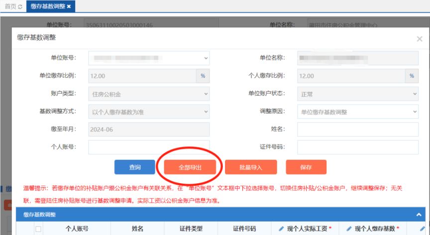 (3)、单位缴存人数多的可按导出数据走批量渠道,先进行【全部导出】单位所有人员原缴基数列表。