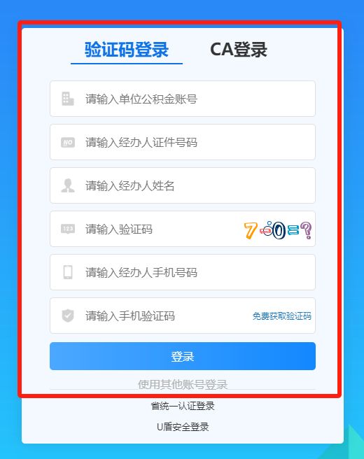 2、跳转到单位登录界面,在界面上录入单位公积金账号、经办人身份证号码、经办人姓名、验证码、经办人手机号码,在确认填入信息无误后,点击【免费获取验证码】按钮,然后输入接收到的【动态验证码】,点击【登录】按钮即可。