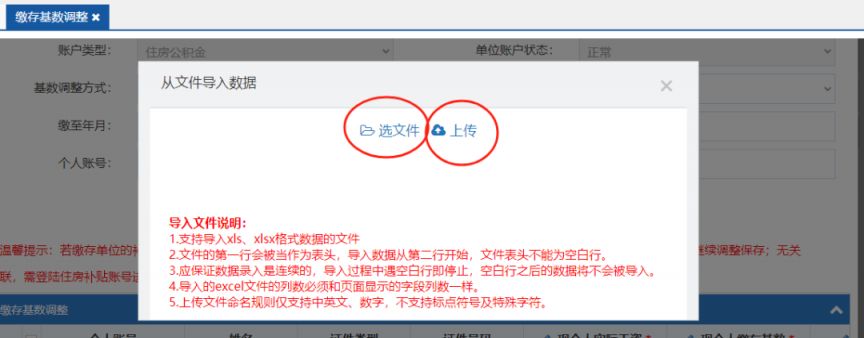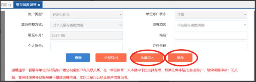 (5)、excel调整后,需返回单位基数调整页面再进行【批量导入】按照提示信息修改正确后进行数据【上传】,上传确认无误后点击【保存】。