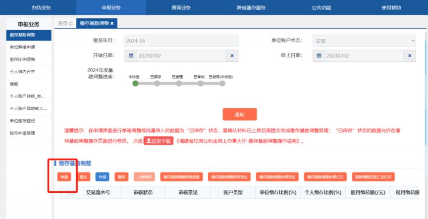 (6)、在申请界面选择审核状态为“已保存”的数据,需确认无误后点击【提交】完成缴存基数调整。