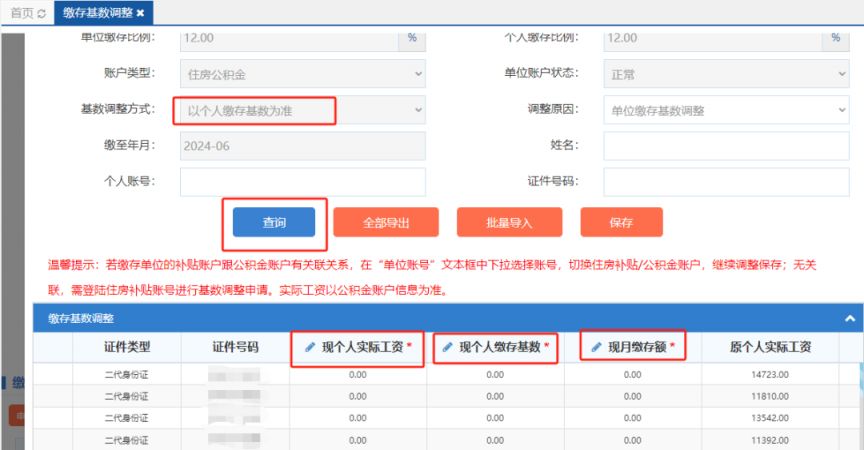 (3)、单位经办人点击【查询】可查询到单位所有员工原缴基数信息。基数调整方式默认选择“以个人缴存基数为准”,调整【现个人实际工资】、【现个人缴存基数】、【现月缴存额】,双击即可进入编辑状态,end键或tab键退出编辑。