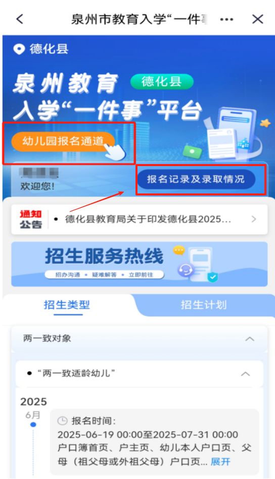 (1)查看录取幼儿园名称、班级及入园须知等信息。