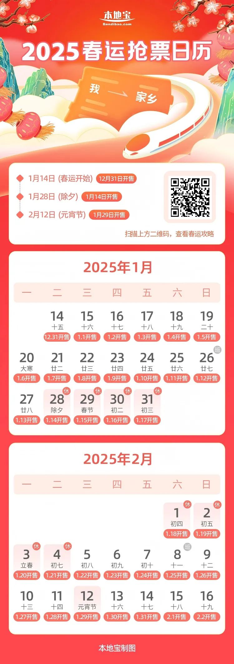 2025年春运火车票抢票攻略及关键日期日历如下:
