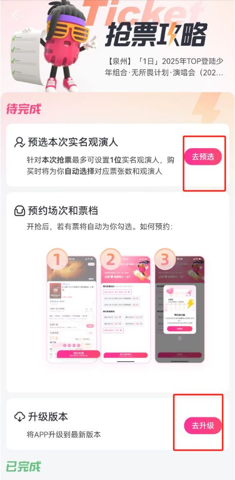 3、没有到抢票时间前,可以点击“抢票攻略”,预选观演人信息,添加抢票提醒,如果大麦APP不是最新版,也要升级到最新版;