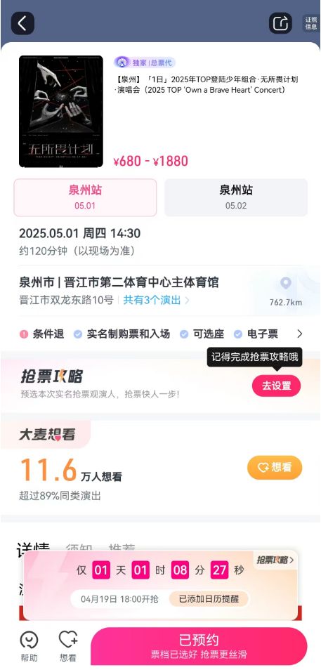 【2025年4月19日18:00-20:00】前往大麦APP进行5月1日演唱会的购票码购票。