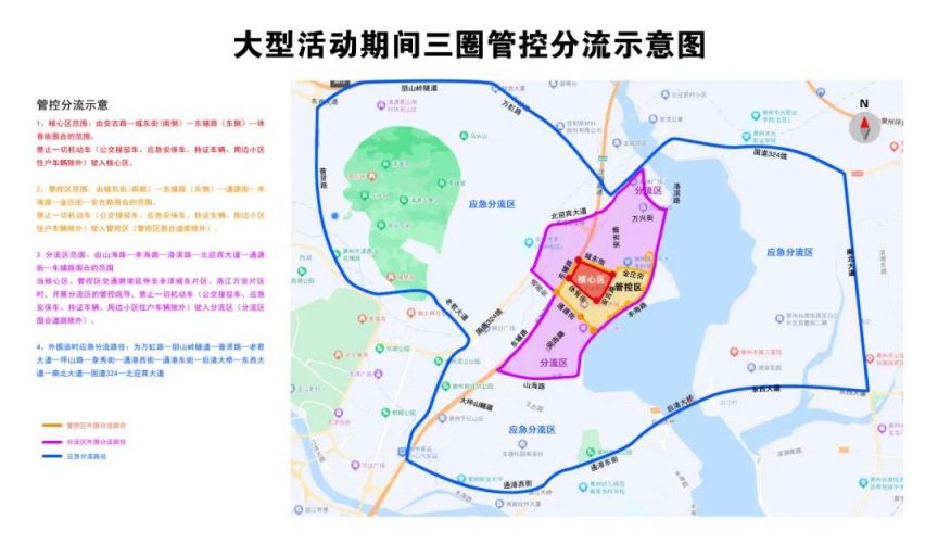 泉州2025年咪咕汇期间交通管制 2025年4月19日,泉州市海峡体育中心将举办大型活动,周边路段预计将迎来大量人流。为确保道路交通安全有序,根据《中华人民共和国道路交通安全法》第三十九条之规定,丰泽交警部门将对部分路段实行交通管制,具体通告如下: 一、交通管制时间 2025年4月19日17:00至疏散完毕 二、交通管制措施 1、核心区 范围:安吉路—城东街(南侧)—东辅路(东侧)—体育街围合的范围。 管制措施:禁止一切机动车【公交接驳车、应急车辆、安保车辆、持证车辆(含周边小区住户车辆)除外】进入管控范围内,禁止一切机动车辆在管控路段内临时停放。 2、管控区 范围:城东街(南侧)—东辅路(东侧)—通源街—丰海路—金庄街—安吉路围合的范围。 管制措施:禁止一切机动车【公交接驳车、应急车辆、安保车辆、持证车辆(含周边小区住户车辆)除外】进入管控范围内(围合道路除外),禁止一切机动车辆在管控路段内临时停放,指挥引导管控区内一切车辆往外围绕行。 3、分流区 范围:由山海路—丰海路—洛滨路—北迎宾大道—通源街—东辅路围合范围。 管制措施:当城东片区、万安片区出现拥堵,启动分流区分流措施。开展分流区的管控疏导,禁止一切机动车【公交接驳车、应急车辆、安保车辆、持证车辆(含周边小区住户车辆)除外】进入分流区(分流区围合道路除外),指挥核心、管控区内一切车辆往外围(洛江、台商、惠安、鲤城、晋江、丰泽东海、城东北峰快速通道)绕行。 4、应急分流区 范围:万虹路—朋山岭隧道—普贤路—老君大道—坪山路—泉秀路—通港西街—通港东街—后渚大桥—东西大道—南北大道—国道324—北迎宾大道 管制措施:当分流区发生严重拥堵,立即开展外围分流路径疏导工作。  交通管制期间带来的出行不便,敬请广大市民群众予以理解和支持,并提前做好出行规划,自觉服从交警和现场管理人员的指挥引导,确保道路交通安全、有序、畅通。 举报