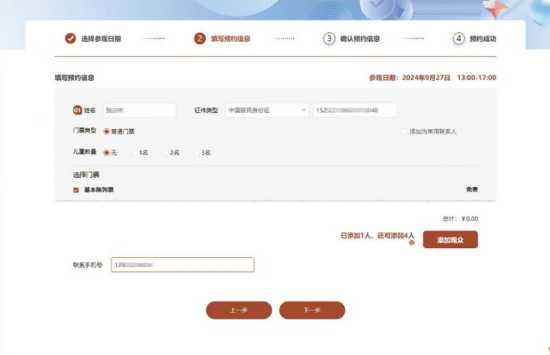 3.登录后,选择需要预约的日期和参观时间,填写预约信息;
