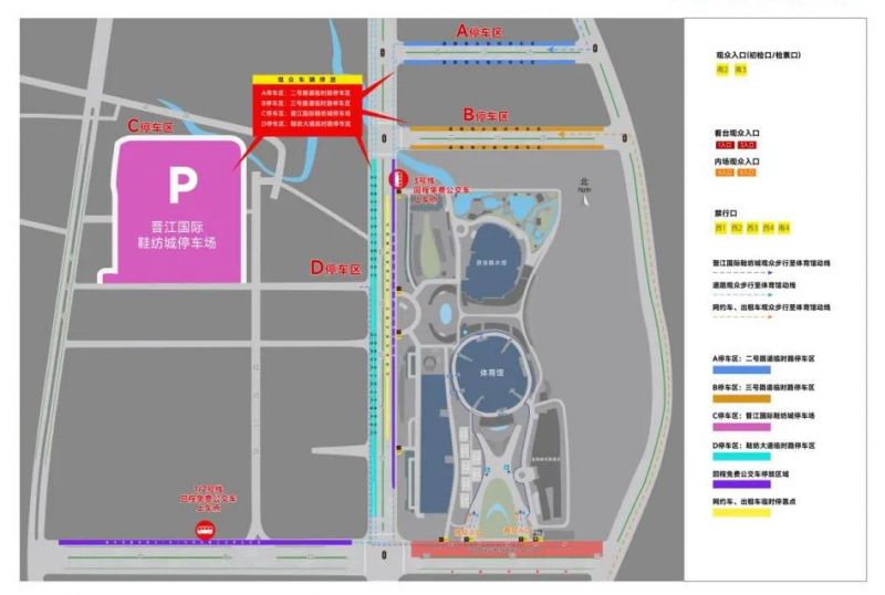 2.管控区:即双龙路、沿海大通道、晋新路围成区域,区域内部分路面施划临时停车区,适时实施交通管制,晋江大桥方向管控车辆由二号路、三号路右转进入管控区。双龙路(鞋纺大道灯控路口至沿海大通道灯控路口)在观众进场和散场期间,采取临时封闭管制。