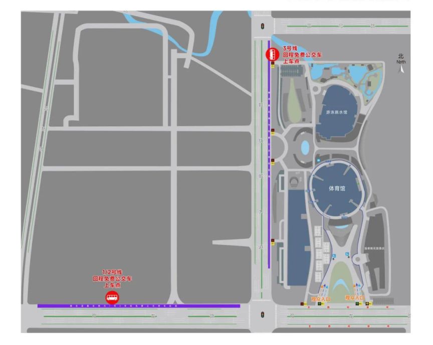 进场时,均从二体中心南门进入;退场时,二体中心所有通道打开,均可退场。封闭双龙路二体段北侧辅道,作为观众出入缓冲区域。看台观众主要以场馆西门(靠鞋纺大道一侧)作为主要疏散通道。